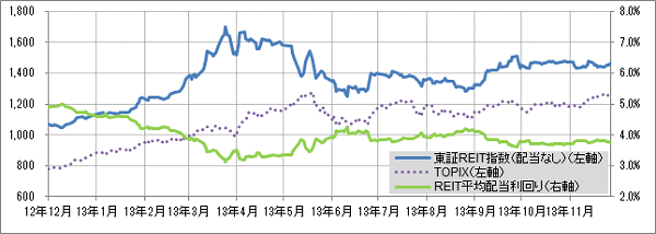 <東証 REIT 指数と予想配当利回りの推移> (グラフは 2012年 12 月~2013 年 11 月の 12 ヶ月間)