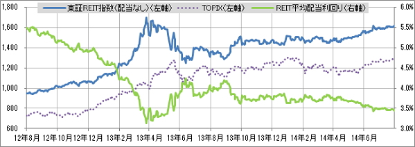 <東証REIT指数と予想分配金利回りの推移> (グラフは2012年8月~2014年7月の24ヶ月間)