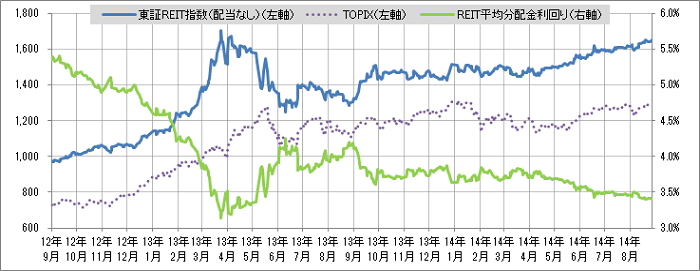 <東証REIT指数と予想分配金利回りの推移> (グラフは2012年10月~2014年9月の24ヶ月間)