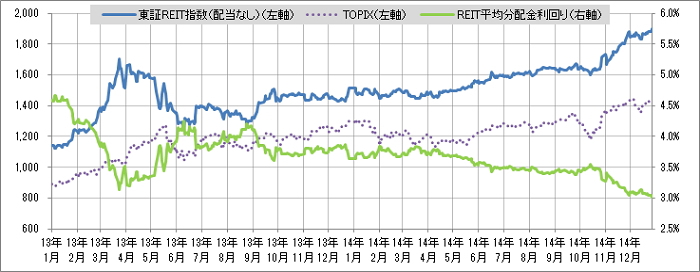 <東証REIT指数と予想分配金利回りの推移> (グラフは2013年1月~2014年12月の24ヶ月間)