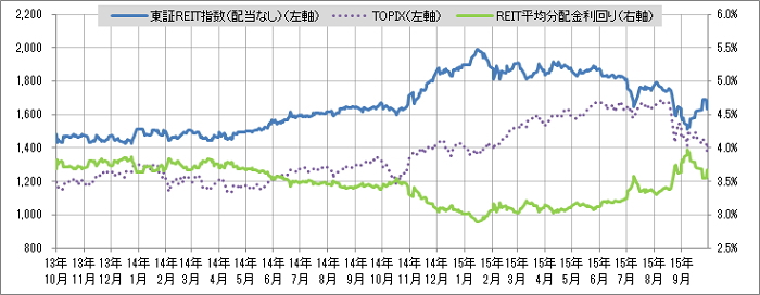 <東証REIT指数と予想分配金利回りの推移> (グラフは2013年10月~2015年9月の24ヶ月間)