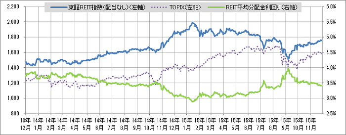 <東証REIT指数と予想分配金利回りの推移> (グラフは2013年12月~2015年11月の24ヶ月間)