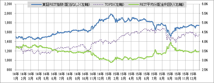 <東証REIT指数と予想分配金利回りの推移> (グラフは2014年1月~2015年12月の24ヶ月間)