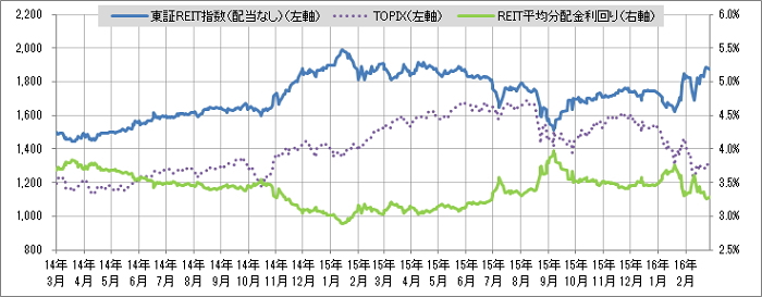 <東証REIT指数と予想分配金利回りの推移> (グラフは2014年3月~2016年2月の24ヶ月間)