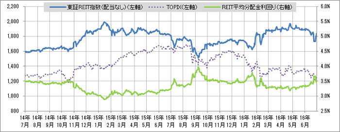 <東証REIT指数と予想分配金利回りの推移> (グラフは2014年7月~2016年6月の24ヶ月間)