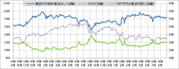 <東証REIT指数と予想分配金利回りの推移> (グラフは2014年9月~2016年8月の24ヶ月間)