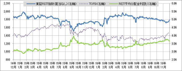 <東証REIT指数と予想分配金利回りの推移> (グラフは2014年12月~2016年11月の24ヶ月間)