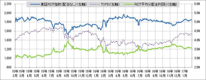 <東証REIT指数と予想分配金利回りの推移> (グラフは2015年2月~2017年1月の24ヶ月間)