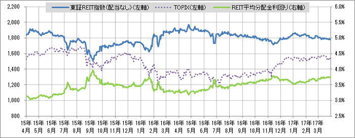 <東証REIT指数と予想分配金利回りの推移> (グラフは2015年4月~2017年3月の24ヶ月間)