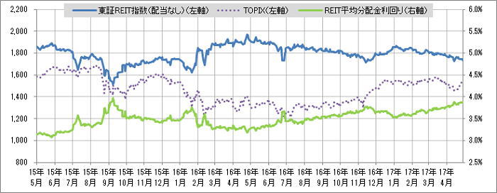 4月末の東証REIT指数(配当なし)は1,733.96ポイントと、前月比-2.39%の下落。米国のシリア攻撃や北朝鮮情勢等、地政学リスクに伴いリスク回避の姿勢が強まるなか、東証REIT指数も下落相場の影響を受けた。特に北朝鮮問題が緊迫化した月中に掛けて大幅下落し、14日終値は1,726.89ポイントと、昨年11月以来5ヶ月ぶり安値を付けた。下落の反動から17日は一旦急反発する場面もあったが、月後半は北朝鮮問題の後退やトランプ氏の税制改革期待から株式相場が大幅反発するのに対し、東証REIT指数は再び下落。日銀がイールドカーブコントロールの維持を示唆し、長期金利が低位安定して推移するも、東証REIT指数の戻りは鈍く、好調な株式相場に対し出遅れ感が強まった。
