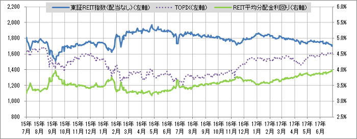 <東証REIT指数と予想分配金利回りの推移> (グラフは2015年7月~2017年6月の24ヶ月間)