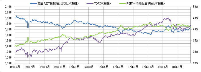 <東証REIT指数と予想分配金利回りの推移> (グラフは2016年5月~2018年4月の24ヶ月間)