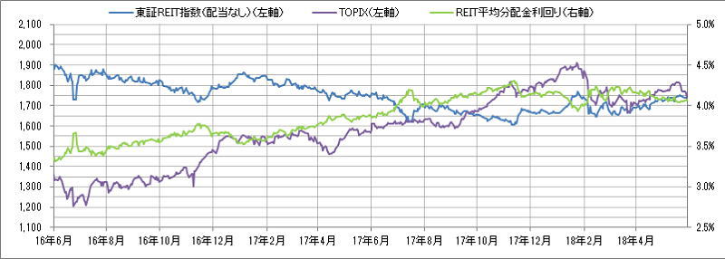 <東証REIT指数と予想分配金利回りの推移> (グラフは2016年6月~2018年5月の24ヶ月間)
