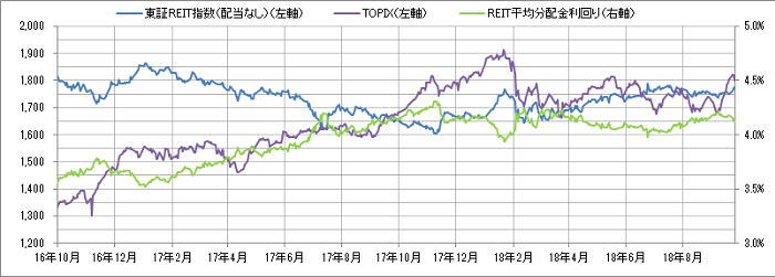 <東証REIT指数と予想分配金利回りの推移> (グラフは2016年10月~2018年9月の24ヶ月間)