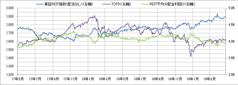<東証REIT指数と予想分配金利回りの推移> (グラフは2017年5月~2019年4月の24ヶ月間)
