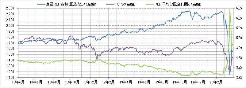 <東証REIT指数と予想分配金利回りの推移> (グラフは2018年4月~2020年3月の24ヶ月間)
