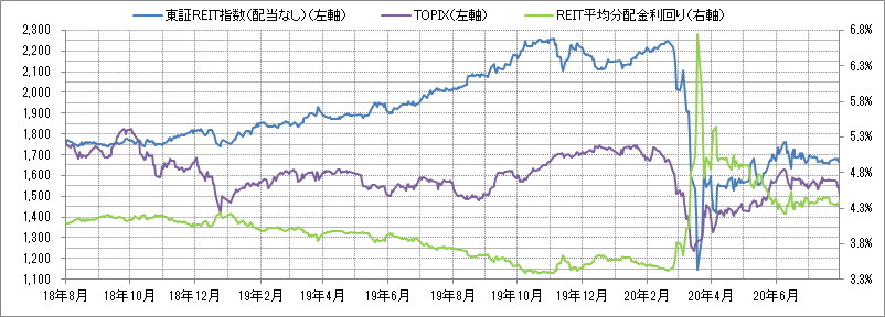<東証REIT指数と予想分配金利回りの推移> (グラフは2018年8月~2020年7月の24ヶ月間)
