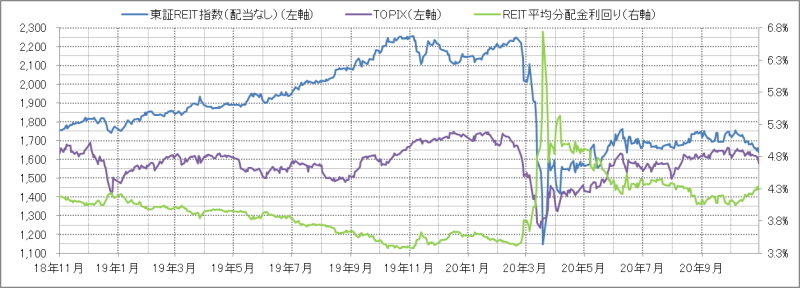 <東証REIT指数と予想分配金利回りの推移> (グラフは2018年11月~2020年10月の24ヶ月間)