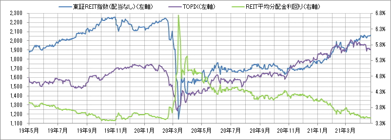 <東証REIT指数と予想分配金利回りの推移> (グラフは2019年5月~2021年4月の24ヶ月間)