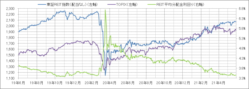 <東証REIT指数と予想分配金利回りの推移> (グラフは2019年6月~2021年5月の24ヶ月間)