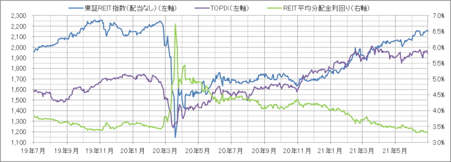 <東証REIT指数と予想分配金利回りの推移> (グラフは2019年7月~2021年6月の24ヶ月間)