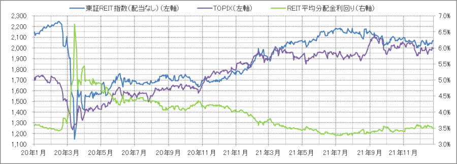 <東証REIT指数と予想分配金利回りの推移> (グラフは2020年1月~2021年12月の24ヶ月間)