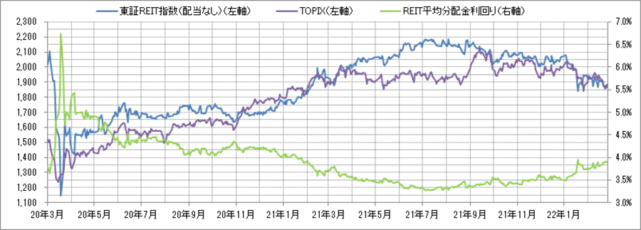 <東証REIT指数と予想分配金利回りの推移> (グラフは2020年3月~2022年2月の24ヶ月間)