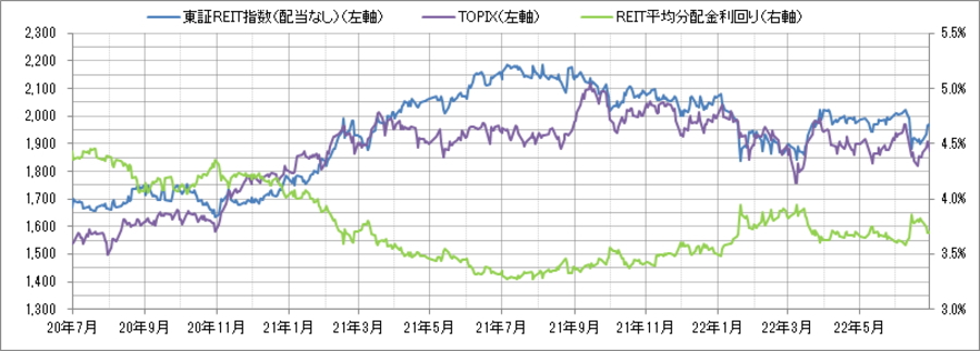 <東証REIT指数と予想分配金利回りの推移> (グラフは2020年7月~2022年6月の24ヶ月間)