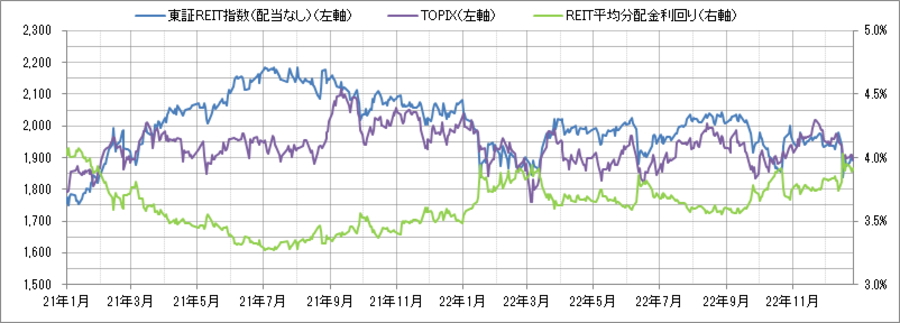 <東証REIT指数と予想分配金利回りの推移> (グラフは2021年1月~2022年12月の24ヶ月間)