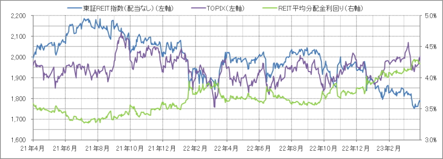 <東証REIT指数と予想分配金利回りの推移> (グラフは2021年4月~2023年3月の24ヶ月間)