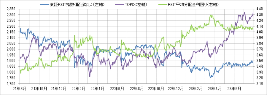 <東証REIT指数と予想分配金利回りの推移> (グラフは2021年8月~2023年7月の24ヶ月間)