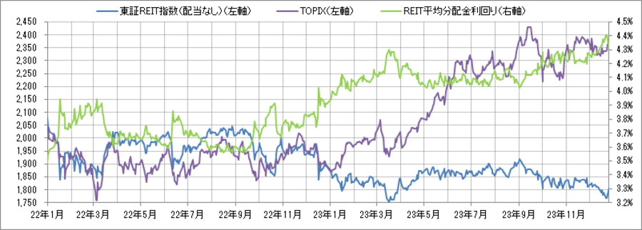 <東証REIT指数と予想分配金利回りの推移> (グラフは2022年1月~2023年12月の24ヶ月間)