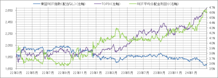 <東証REIT指数と予想分配金利回りの推移> (グラフは2022年3月~2024年2月の24ヶ月間)