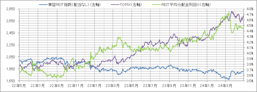 <東証REIT指数と予想分配金利回りの推移> (グラフは2022年5月~2024年4月の24ヶ月間)