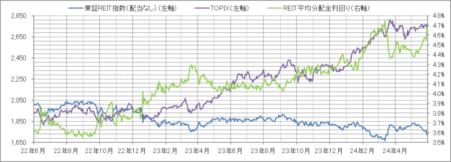 <東証REIT指数と予想分配金利回りの推移> (グラフは2022年6月~2024年5月の24ヶ月間)
