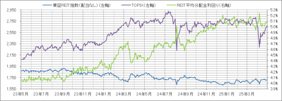 <東証REIT指数と予想分配金利回りの推移> (グラフは2023年5月~2025年4月の24ヶ月間)
