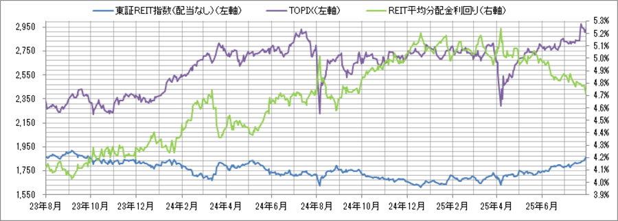 <東証REIT指数と予想分配金利回りの推移> (グラフは2023年8月~2025年7月の24ヶ月間)