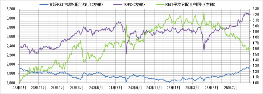 <東証REIT指数と予想分配金利回りの推移> (グラフは2023年9月~2025年8月の24ヶ月間)