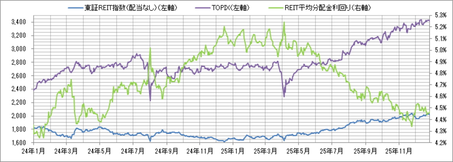 <東証REIT指数と予想分配金利回りの推移> (グラフは2024年1月~2025年12月の24ヶ月間)